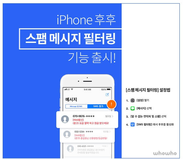 - '설정' > '메시지' > '알 수 없는 연락처 및 스팸' > 'SMS 필터링'에서 '후후'를 선택합니다.