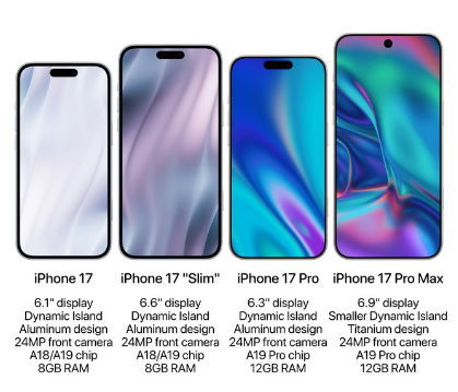 이번 아이폰 17은 총 4가지 모델로 출시될 예정입니다. 우선 기본 모델인 아이폰 17, 슬림 모델인 아이폰 17slim, 프로 모델인 아이폰17pro, 그리고 최상위 모델인 아이폰17pro max가 있습니다. 각 모델은 다양한 스펙을 가지고 있으며 특히 프로 모델은 고급스러운 기능들을 탑재할 것으로 보고 있습니다.